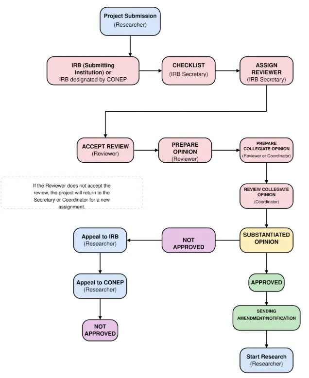 The submission process works as follows: the researcher registers the project on the Plataforma Brasil system and submits it to the CEP of their institution. If the project is approved by the CEP and falls under one of the special thematic areas, it is automatically forwarded to CONEP for a second review. This means that CONEP only evaluates projects that have already passed an initial review by a CEP. The flow of project submission to Ethics Committees is illustrated in Figure 1.